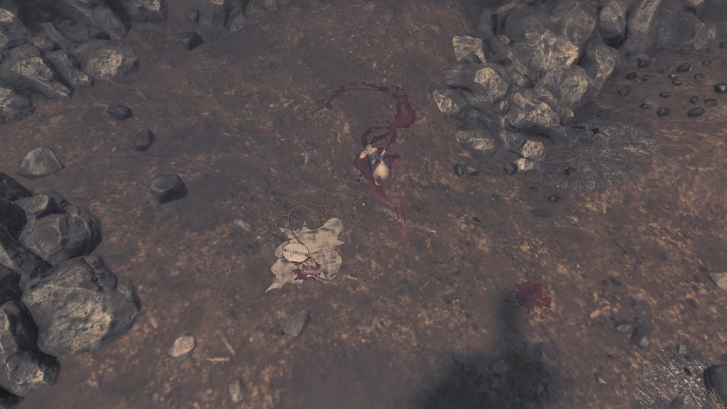Игрокам нужно проползти через дыру и выйти в кратер на противоположной стороне. Мы полагаем, что это тот же кратер из вступительных сцен, который игроки видят при первом запуске Amnesia: The Bunker, хотя это не подтверждено. После изучения кратера некоторое время игроки должны увидеть что-то блестящее на солнце. Перейдите к этому предмету, чтобы найти жетон и игрушку-кролика.