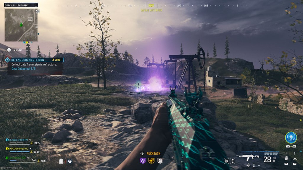 Сферы комбайна чаще всего встречаются в правой части карты в Call of Duty: MW3 Zombies Mode. В зоне низкой угрозы на этой стороне карты мы встретили несколько сфер Жнеца. Их легко заметить, потому что они ярко-фиолетового цвета, летают по небу и имеют на карте уникальный значок, похожий на атом.