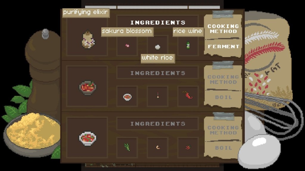 Отправляйтесь на кухню бани, если вы купили этот ремонт, или вернитесь к себе домой, чтобы открыть интерфейс приготовления и прочитать рецепт. Сделав это, вы узнаете, что очищающий эликсир состоит из трех ингредиентов: