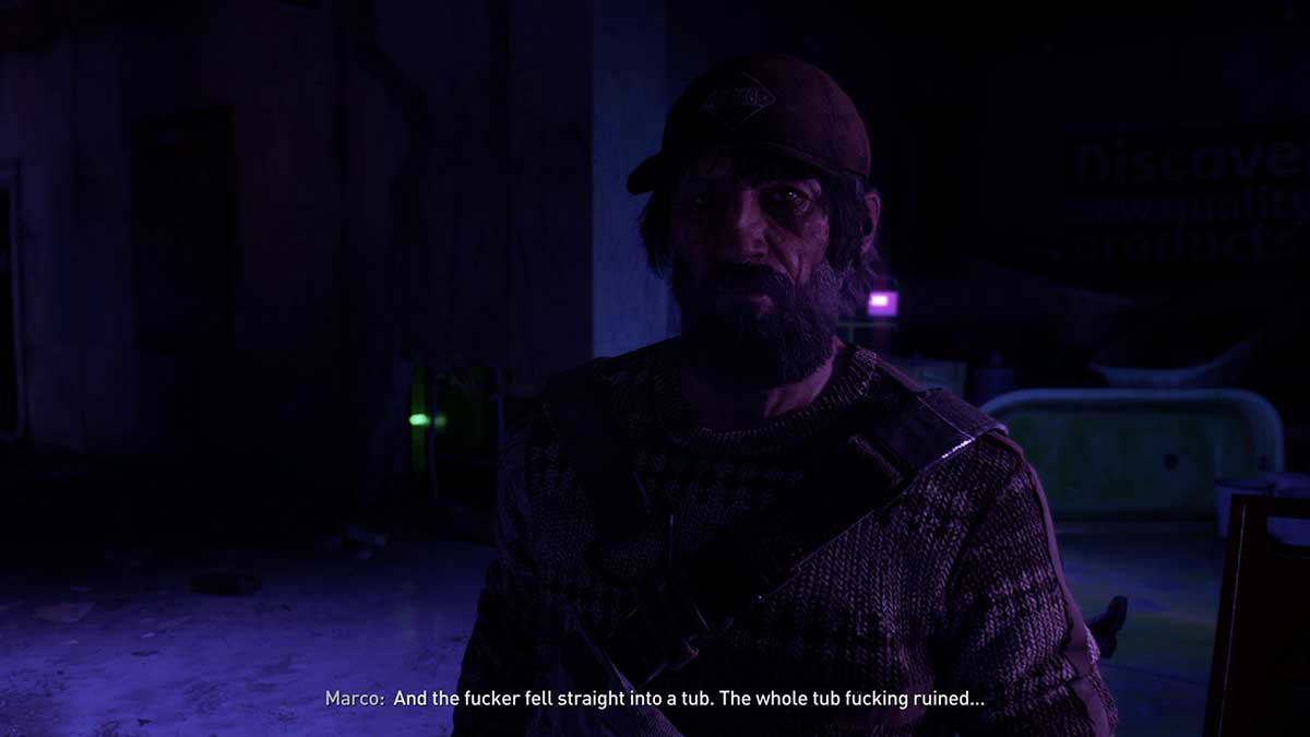 Затем следуйте по другому маркеру цели, чтобы найти Марко. Он тоже находится внутри здания, в которое вы должны войти с крыши. Обвинив его в продаже отравленной воды, он говорит вам, что не может достать ее из-за зараженных внизу. Вам нужно спуститься туда через ближайшую стену и убить зараженного. Когда вы очистите дверной проем, появится Марко и начнет с вами разговаривать.