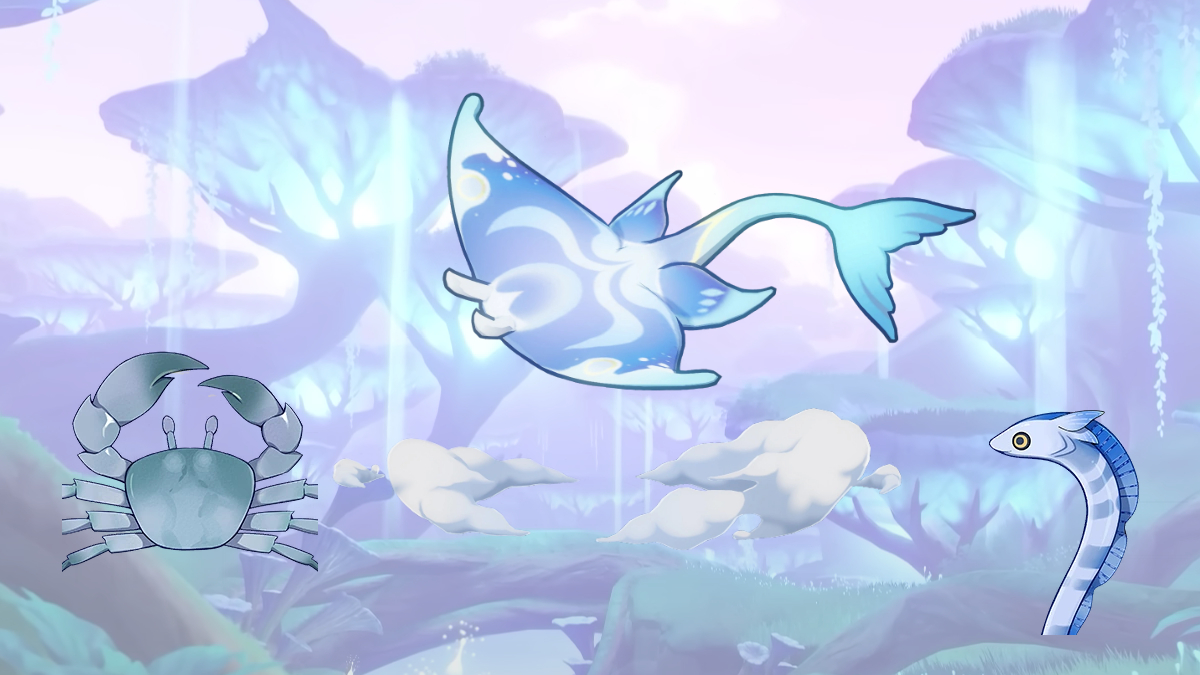 Украшенный унаги Синяя корона Зяблик Синяя лягушка Синеплавник Окунь Голубая ласка Сумеречная птица Изумрудный зяблик Плоский гребень Глупыш Плавающий скат Неторопливая выдра Удачный свет Муха Костный мозг/Синяя рогатая ящерица Океанский краб Сланец Зонтичный зяблик Фиолетово-золотая чайка-удильщик