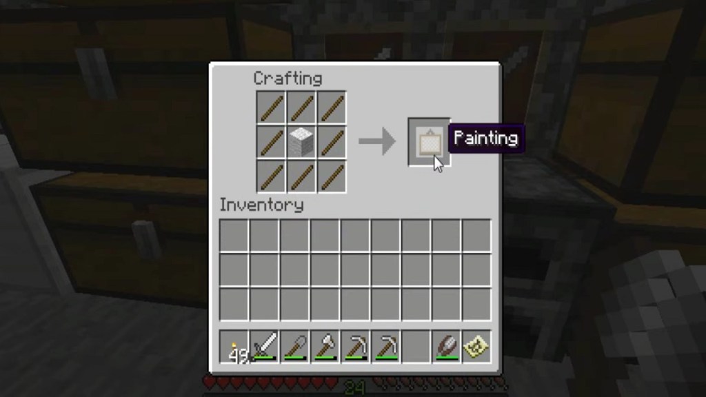 Нарисовать одну картину довольно просто. Все, что вам нужно сделать, это положить восемь палочек и один блок шерсти на верстак; вам нужно положить одну шерсть в центр и восемь палочек вокруг него, чтобы получить картину.