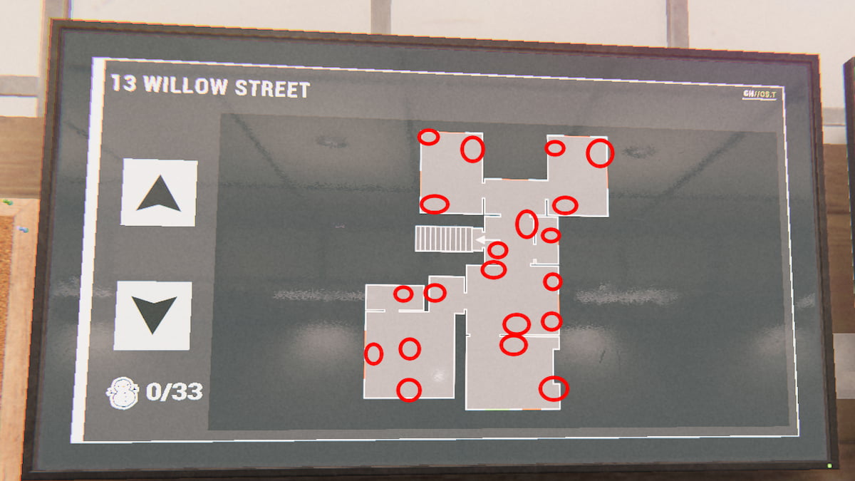 На этой карте вам нужно найти 33 танцующих снеговика. К счастью, вам нужно исследовать только два этажа, но за пределами дома вы найдете семь. Один находится на грузовике, четверо вокруг дома, один за внешним блоком переменного тока, а последний — на живой изгороди справа от дома.